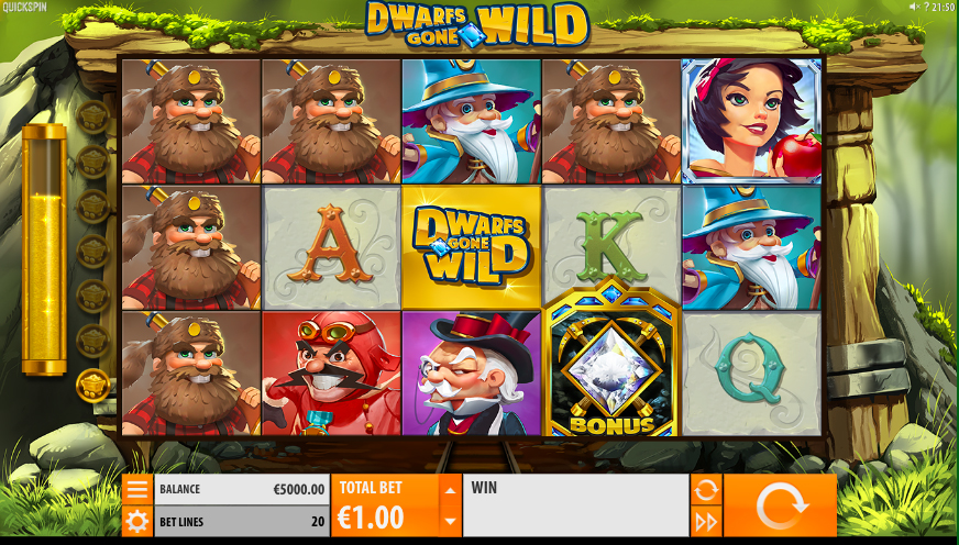 Dwarfs Gone Wild is a 5-reel slot with 20 fixed paylines and a maximum possible win of 5,000 coins. A game based on the legend of dwarfs, you can win frequently during the base game thanks to free spins and other features. Thanks to these features, there are plenty of opportunities to win in this slot.