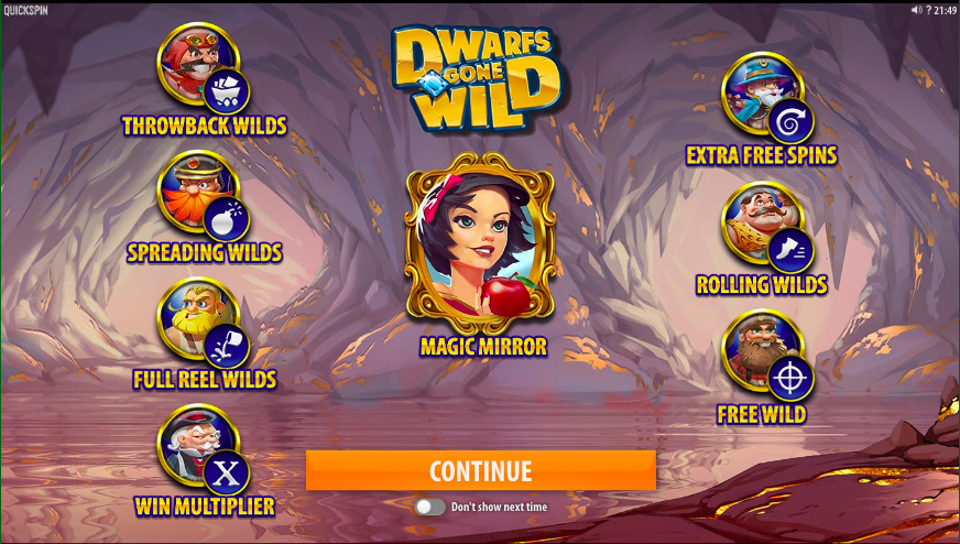 Apart from the free spins, there’s another bonus feature in the Dwarfs Gone Wild slot called Magic Mirror. It is triggered by 3 magic mirror symbols on the reels in the base game that add a whopping 300 high-paying Snow White symbols on the reels. You’re granted 2 respins and with all those Snow White symbols in play, the chances to land a stunning win (or two) are quite high.