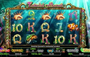 Once you start playing, in order to trigger a prize you’ll need to wait for at least two identical symbols to appear consecutively on any payline that you’ve activated, from left to right. The lowest prizes offered by the Enchanted Mermaid online slot are given by the card symbols which can pay 5-300 coins, depending on the symbol. If you want bigger payouts, wait for the turtle and fish symbols as they hide rewards that start at 4 coins and go up to a very attractive 5,000 coins per sequence.
