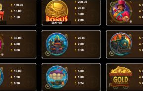 Icon designs showcase the sheer scale of this factory. You have the.. less than trustworthy guide and an impressionable young boy touring the facility. Along the way, they see a high tech tower, a steam train, a submarine, a hot air balloon, and so much gold. The game’s logo is the Wild, while a golden coin is the Scatter.